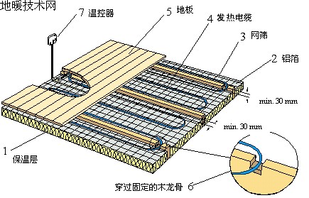 發熱電纜電地暖系統組成:保溫板、反射膜、鋼絲網、發熱電纜、溫控器。”即形成了一套地暖系統。特點:線狀高溫傳導加熱,無紅外輻射加熱.