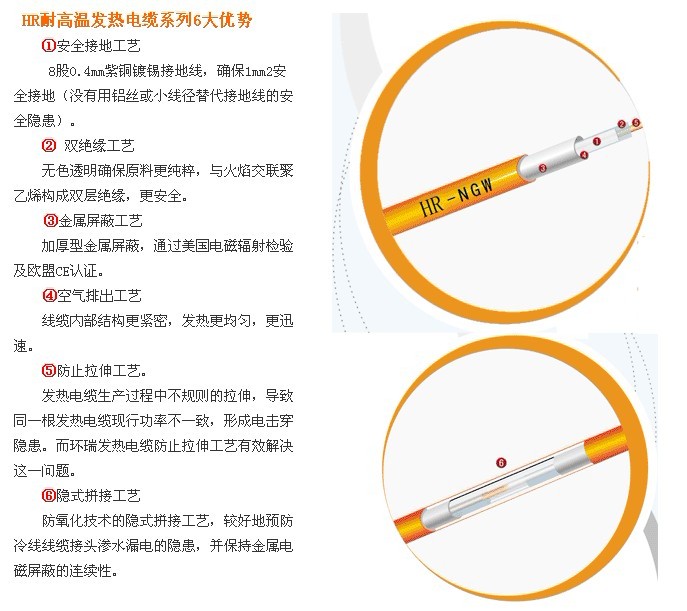 安徽環(huán)瑞采用新的雙絕緣工藝耐高溫的發(fā)熱電纜,包括有發(fā)熱合金,所述的發(fā)熱合金外依此包覆無(wú)色透明氟隆絕緣層、火焰及蒸汽交聯(lián)聚乙烯絕緣層、8*0.4mm鍍錫紫銅絲接地、加厚型金屬電磁屏蔽,阻燃型PVC外護(hù)套使用方便安全,壽命長(zhǎng),適用于高溫環(huán)境下的輻射供暖。