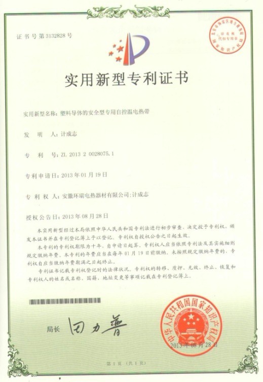 環(huán)瑞自成立研發(fā)小組至科學(xué)技術(shù)中心期間,通過獨(dú)立開發(fā),與合肥工業(yè)大學(xué)建立長期合作關(guān)系,聘請相關(guān)專業(yè)的技術(shù)專家等模式,投入大量的人力物力。我司以安全,實(shí)用性能為目標(biāo),對電伴熱帶結(jié)構(gòu)、原材料、生產(chǎn)工藝進(jìn)行創(chuàng)新,最新研發(fā)的“三層共擠自控溫電伴熱帶”“ 塑料導(dǎo)體的安全型自控溫電熱帶”獲得了2項(xiàng)國家專利證書。我司已獲得了5項(xiàng)關(guān)于自限溫伴熱帶的國家專利證書,我司伴熱帶的生產(chǎn)技術(shù)已達(dá)到國內(nèi)先進(jìn)。共計(jì)19項(xiàng)專利。新的專利證書已下達(dá)。