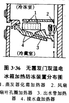 加熱防凍裝置中的出水管加熱器處于經(jīng)常加熱狀態(tài),接水盤加熱器和風(fēng)扇扇葉孔圈加熱器則僅在蒸發(fā)器加熱化霜時才工作。接水盤加熱器裝置在接水盤的外表面,其作用是防止霜水滴人接水盤內(nèi)凍結(jié)積累而損壞周圍結(jié)構(gòu)。裝置出水管加熱器的目的是防止霜水導(dǎo)出箱外時發(fā)生“冰堵”,造成霜水滋出盤外,淋濕并污染食品。風(fēng)扇扇葉孔圈加熱器裝置在風(fēng)扇扇葉孔圈部位,在對蒸發(fā)器加熱化霜時它對扇葉孔圈部位加熱,防止該部位因凝霜過厚而將扇葉卡住,造成箱內(nèi)冷風(fēng)的正常循環(huán)中斷,甚至燒毀風(fēng)扇電機。